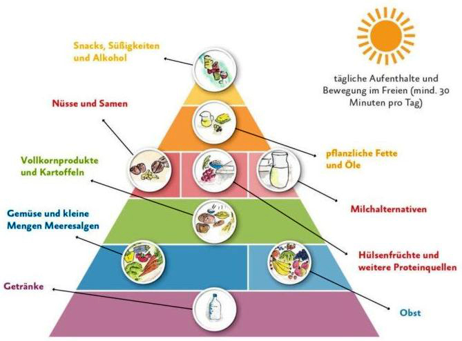 Der Hauptteil soll wie bei jeder Ernährungspyramide aus Wasser oder ungesüßtem Tee bestehen, 3 Portionen Gemüse am Tag entsprechen (ca. 400 gramm) und 2 Portionen Obst (250gramm). Danach kommen Kartoffeln und Vollkorngetreide sowas wie Dinkel, Roggen, Bulgur Haferflocken, Hirse oder Pseudogetreide wie Amaranth und Quinoa. Nüsse, Samen und Kerne sind gute Eiweißlieferanten und besitzen außerdem noch unzählige andere Vitamine und Mineralien die in der veganen Ernährung nicht fehlen dürfen. Sowie Hülsenfrüchte wie Kichererbsen, Weiße Bohnen, schwarze Bohnen, Kideybohenn, Erbsen oder leicht verarbeitete Produkte aus Soja wie Soja-milch/joghurt, Tofu, Falafel aus Kichererbsen, Tempeh usw. Pflanzliche Fette sind außerdem sehr wichtig. Fette klingen erstmal ungesund sind aber je nach Art lebensnotwenig. Bei einer gesunden Ernährung sollte man gesättigte Fettsäuren (in Schokolade, Fastfood, stark verarbeiteter Nahrung zu finden) eher vermeiden, dafür ungesättigte und mehrfach ungesättigte Fettsäuren in Maßen willkommen heißen (zu finden in pflanzlichen Ölen, Nüssen, Samen, Avocado…)
